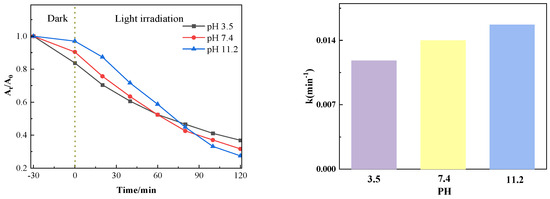 Figure 11 shows the influence of different pH values on the catalytic degradation effect. It can be seen from the figure that after the dark reaction, when the adsorption equilibrium between the pollutant and the catalyst is reached, the lower the pH of the solution, the greater the adsorption capacity of the catalyst, which is conducive to the degradation of the pollutant. When the pH value of the system increases, although the adsorption is weakened, the increase of OH− in the solution is conducive to forming more free radicals, thus accelerating the degradation. Changes in pH significantly alter electrostatic and non-electrostatic interactions by influencing the surface charge of the catalyst and the ionization state of pollutant molecules, thereby affecting adsorption capacity and radical generation efficiency. Enhanced adsorption capacity at low pH values and increased radical production at high pH values collectively ensure the efficient degradation performance of PTCN samples under different pH conditions, providing strong support for their application in practical wastewater treatment.