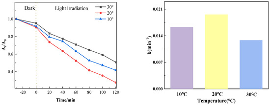 Figure 12 shows the photocatalytic degradation effect when the amount of PTCN is 0.75 g/L, the concentration of chloromycetin hydrochloride is 20 mg/L, and the photocatalytic degradation temperature of chloromycetin is varied (10 °C, 20 °C, 30 °C). As can be seen from the figure, the photocatalytic degradation efficiency gradually decreases with the increase in temperature.