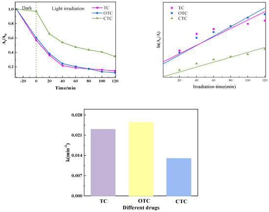 The dark reaction was conducted for thirty minutes after the PTCN samples were added to TC, OTC, and CTC solutions. At that point, it stopped, and the light response began. The samples exhibited an excellent ability to degrade tetracycline antibiotics, as shown by the figure after the photocatalytic reaction was conducted for 90 min. The first-order kinetic approach was employed to model the photocatalytic degradation kinetics of TC, OTC, and CTC. The Figure 13 illustrates a strong linear correlation between the photocatalytic reaction time (t) and each medication’s concentration ratio, ln(C0/Ct).