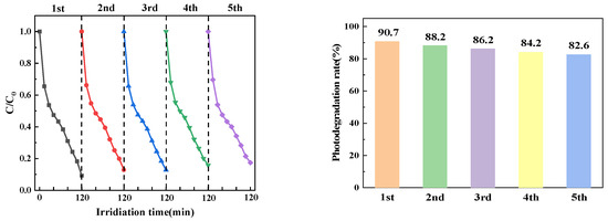 In practical applications, the stability of photocatalysts is a significant factor to be considered. The reaction process of PTCN degradation of CTC was repeated by collecting, washing, and drying the remaining catalysts for the next cycle test. As shown in the Figure 14, even after five reuses, the degradation rate of the PTCN photocatalyst still reached 82.59%, which indicates that the photocatalyst has high stability and catalytic efficiency.