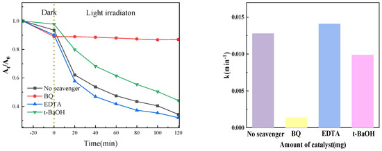The radical trapping experiment can determine the main active substances in the photocatalysis process and then speculate the possible reaction mechanism. In the experiment, 1, 4-benzoquinone (BQ), tert-butanol (t-BaOH), and EDTA-2Na were used to trap superoxide free radicals (•O2−), hydroxyl free radicals (•OH), and holes (h+), respectively, with a scavenger concentration of 1 mM. Figure 16 presents the outcomes of the experiment. The photocatalytic degradation rate was dramatically decreased when BQ was added to the system to eliminate superoxide free radicals, as the figure shows. This suggests that superoxide free radicals were the primary active ingredient in our experiment. Similarly, introducing t-BaOH can also reduce the degradation rate to a certain extent, indicating that •OH also plays a specific role in the photocatalytic process. However, in this system, superoxide radicals (•O2−) and hydroxyl radicals (•OH) are the primary active species. Upon the addition of EDTA-2Na to capture holes, the hole concentration decreases, subsequently reducing the probability of electron-hole recombination. Consequently, more photogenerated electrons are available to participate in the generation of active species, thereby enhancing the degradation efficiency.