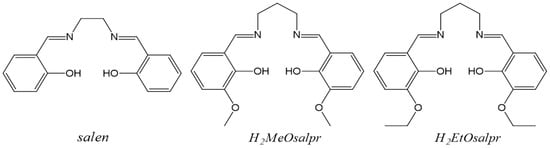The synthesis of these compounds was carried out using products and solvents from Sigma-Aldrich (Diegem, Belgium) and ThermoScientific (Waltham, MA, USA). The preparation of the ligand N,N′-bis(3-ethoxysalicylidene)propylene-1,3-diamine (H2EtOsalpr) was carried out by a reaction between propylenediamine and 3-ethoxysalicylaldehyde (HEtvain) according to the literature [14,28].