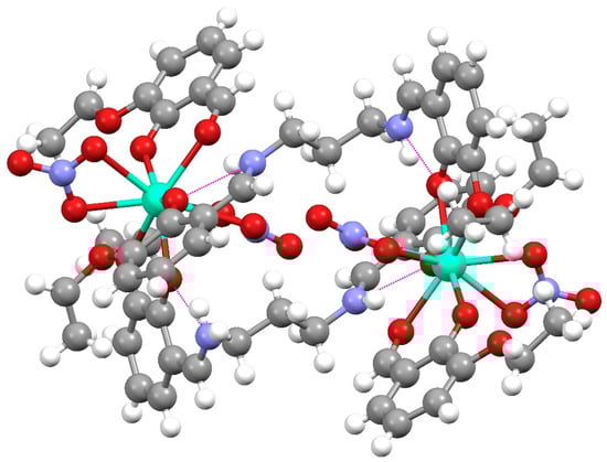 The deprotonated 3-ethoxysalicylaldehyde species appeared in the reaction due to the cleavage of the original ligand, as has been previously commented. The H2EtOsalpr ligands were neutral, with the phenolic hydrogen located on the imino nitrogen and forming an intramolecular hydrogen bond to the phenoxy oxygen atom with the distances of N-H = 0.860(5) Å and O···H = 1.988(5) Å and an N-H···O angle of 132.0(1)°. This hydrogen bond corresponded to the phenolic hydrogen migration to the imine nitrogen, as is usually observed in this type of compound [9]. The presence of this H-bond precluded any possible interactions between the lanthanide ions and the nitrogen atoms, since the Dy-N distances ranged between 4.27 and 4.5 Å, a fact expected from the oxophilicity of the lanthanide ions. The two aromatic parts of the ligand formed a torsion angle of 123.3(1)° in order to accommodate the bridge between the metal ions. Each of these dimeric units was isolated, and they did not show significant interactions between them (Figure 5).