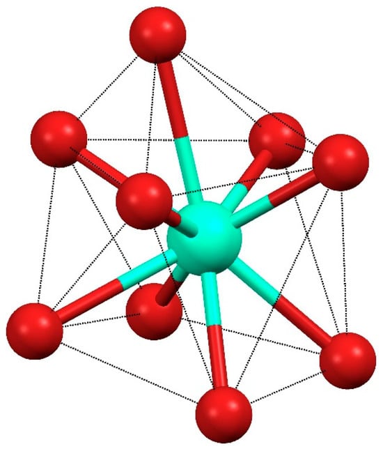 The Dy(III) complex 1 crystallized in the triclinic P-1 (2) space group. The molecular unit consisted of dimers of the formula [Dy(H2EtOsalpr)(NO3)2(Etvain)]2 (Figure 3), in which the Dy(III) atoms were bridged through two H2EtOsalpr ligands showing a Dy(III)···Dy(III) distance of 9.8247(5) Å. The asymmetric unit corresponded to the formula unit, since both halves of the dimer were related through an inversion center. The bridging salen-type ligand coordinated in a bidentate way to one of the dysprosium ions using the phenoxy and ethoxy oxygen atoms of one end, while at the other end, it was linked to the other metal ion in a monodentate fashion through the phenoxy group. The metal–oxygen bond distances were 2.246(3) and 2.283(3) Å for the phenoxy oxygen atoms and 2.714(4) Å for the weakly coordinated ethoxy group. The cation coordination was completed by the four oxygen atoms of two bidentate nitrate groups and two additional oxygen atoms corresponding to the phenoxy and carbonyl groups of a deprotonated 3-ethoxysalicylaldehyde species. The metal–oxygen bond distances in this case were 2.401(4) and 2.233(3) Å, corresponding to the carbonyl and phenoxy oxygen atoms, respectively; these distances are comparable with those found in similar compounds [25]. The coordinative environment of the dysprosium ion corresponded to nine oxygen atoms that surround the metal, forming a distortedly capped square antiprism (Figure 4).