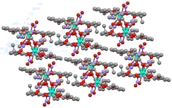 All the studied compounds showed similar solid-state infrared spectra, as they all have the same structure and, therefore, a minimum shift of the main bands was expected (Figure S1). Each of the spectra showed a strong band at around 1644 cm−1, attributed to the ν(C=N) stretching mode of the H2EtOsalpr ligand. This band shifted to higher frequencies relative to the free ligand because of its coordination to the metal ion. In the same way, the ν(C-Ophen) band, appearing at 1220 cm−1, was moved to lower frequencies due to the coordination of the lanthanide ion to the phenolic oxygen atom. At 1619 and 1605 cm−1, two additional bands were observed that corresponded to the carbonyl ν(C=O) vibration mode of the metal-coordinated Etvain ions. In all the complexes studied, the bands corresponding to the nitrate groups appeared at around 1440, 1300 and 1030 cm−1. The values of the frequencies of the compounds obtained suggest that the nitrates were coordinated in a bidentate fashion to the metal ion [24], as confirmed by the single-crystal structure detailed below.
