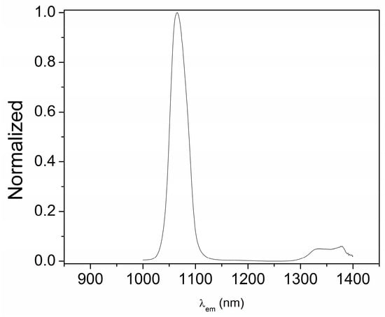 The emission properties of the three compounds were measured in the solid state, using an excitation wavelength of 373 nm since the ligands absorbed in this region. For the emission spectra of neodymium complex 2, a long-pass filter was always placed before detection to reduce the effects of the scattering produced by the solid. In this case, the antenna effect was clearly observed, since an emission maximum at 1060 nm was found (Figure 6). Along with this band, a second emission at around 1340 nm can be observed, as expected.