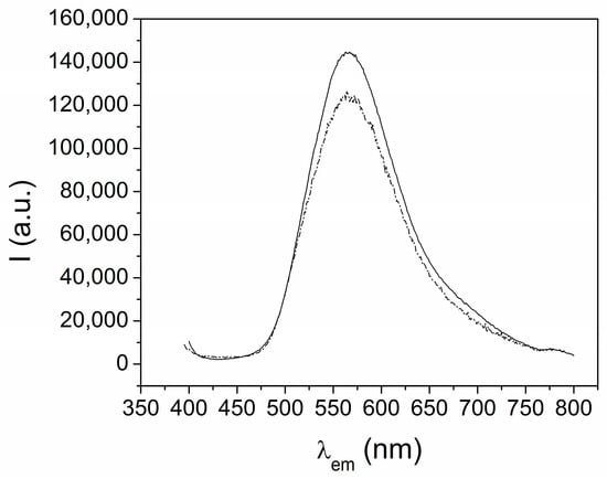 The emission spectra of the Dy and Eu complexes (1 and 3) showed a broad band, centered at 550 nm, that is attributed to the H2EtOsalpr ligand (see below), while the typical emission bands of the lanthanide ions were not observed (Figure 7). If we analyze these spectra, it is not clear whether the lanthanide emission occurred, since the observed band, due to the ligand, is very broad. However, the values of the half-life times for the lanthanide ions appeared in the expected range. Since these measurements are more sensitive than the emission intensities, we assumed that the lanthanide luminescence promoted by the antenna effect of the salen-type ligand was overlapped by the ligand emission. This fact prevents us from identifying the emission of the lanthanide ions, in contrast to what has been reported for the luminescence studies of europium and dysprosium complexes with analogous ligands [26,27].