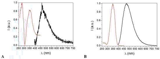 Normalized excitation (red) and emission (black) spectra of the H2EtOsalpr (A) and HEtvain (B) species in ethanol at 298 K. In both cases, λexc = 330 nm for the emission spectra. For the excitation spectra, λem = 473 nm for H2EtOsalpr and λem = 479 nm for HEtvain.