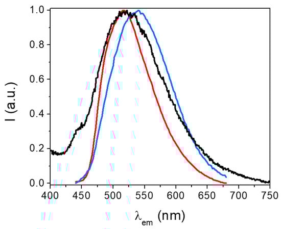 Stationary emission spectra (black) and at different time scales: emissions lasting between 0.1 and 0.2 μs (red, fluorescence) and between 1 and 2 μs (blue, phosphorescence). All spectra have been measured at 77 K (λexc = 373 nm).