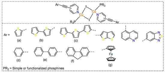 In the ongoing quest for innovative materials with remarkable opto-electronic properties and applications, researchers are investigating a diverse array of small to large molecular systems. Transition metals-based coordination compounds remain at the forefront among the emerging new functional materials due to their diverse photophysical properties and applications [1]. Over the last four decades, there has been a significant surge in the development of d10 ion-based complexes, particularly Cu(I) complexes [2,3]. Unlike traditional organic molecules, Cu(I) complexes can be easily prepared with a diverse range of ligands, allowing for easy manipulation of their structural, photophysical, and electrochemical features [4,5]. To date, a wide variety of Cu(I)-based dimers, tetramers, oligomers, and polymers are known [3,6], with applications in opto-electronics, catalysis, and biologicals [7,8,9]. The physicochemical and photophysical properties of Cu(I) complexes can be fine-tuned and regulated by the ligands and co-ligands used [9]. The most commonly used ligands come from N-donor ligands, which impart high stability to the complexes. Numerous studies have shown that by carefully fine-tuning the coordinated ligands in various complexes, researchers can create a wide array of compounds that exhibit distinct and precisely controlled photophysical properties. These tailored characteristics can lead to innovative applications in different fields. For instance, by adjusting the structure and electronic properties of the ligands, it is possible to enhance light absorption, emission, and overall stability of these complexes, thereby expanding their utility in advanced technologies [9,10,11]. We, in the past, studied various dimeric and tetrameric Cu(I) complexes bearing ethynylpyridine ligands and triarylphosphines as co-ligands (Chart 1). Our studies highlighted that the Cu(I) complexes containing pyridine ligands attached to 4-ethynyl ferrocene display fascinating electrochemical properties [12,13]. In these complexes, the ferrocene units serve as electron reservoirs or sinks, which significantly influence their emission properties in a detrimental manner. Taking this observation into consideration, we shifted our attention to a thorough examination of the structural and photophysical properties of Cu(I) complexes linked to both carbocyclic and heterocyclic ethynylpyridine derivatives [14,15]. We demonstrated linker-dependent optical features in these complexes. We also showed that dimeric complexes incorporating heteroarylethynyl groups are not only highly emissive but also demonstrate reasonable light to electricity conversion efficiency.