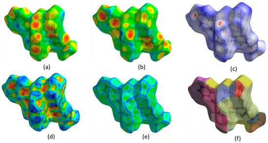 (a) Hirshfeld surfaces (HS) mapped onto di (distance inside), (b) de (distance outside), (c) dnorm (normalized contact distance), (d) shape index, (e) curvedness, (f) fragment patch.