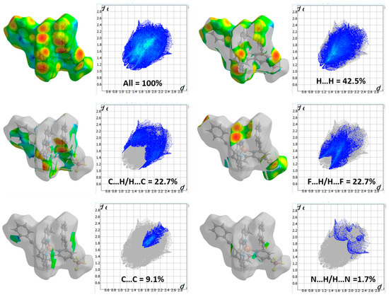 The 2D fingerprint map (Figure 3) quantitatively represents these interactions, highlighting their relative contributions to the overall Hirshfeld surface. The dominant interaction observed is H…H (42.5%), which reflects van der Waals contacts and close packing consequences, playing a vital role in the stabilization of the molecular arrangement. The effective existence of C…H contacts (22.7%) suggests contributions from non-covalent interactions such as C-H•••π interactions or weak hydrogen bonding, which can influence molecular organization. Similarly, F…H interactions (22.7%) indicate the involvement of fluorine in intermolecular contacts, potentially contributing to weak hydrogen bonding or dipole-induced interactions. The presence of C…C interactions (9.1%) suggests the occurrence of π•••π stacking, which is common in conjugated systems and may contribute to the structural stabilization through aromatic interactions. N…H interactions (1.7%) likely correspond to hydrogen bonding, where nitrogen acts as a hydrogen bond acceptor, albeit with a minor contribution. The relatively low percentages of N…C (0.8%) and F…C (0.5%) indicate minimal direct nitrogen-to-carbon and fluorine-to-carbon contacts, possibly due to steric constraints or unfavorable orientations. These outcomes reveal that van der Waals interactions and hydrophobic forces, especially reflected in the dominance of H…H and C…H interactions, significantly influence the molecular packing. Further, the prominence of F…H contacts emphasizes the role of fluorine in modulating intermolecular forces. Rather than merely affirming the stability of the complex, this investigation furnishes a deeper understanding of the specific non-covalent interactions (NCIs) governing the crystal packing, offering valuable insights into the molecular arrangement in the solid state [23,24].