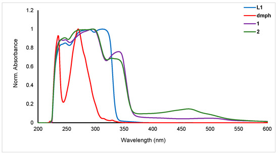 Electronic spectra of the ligand (L1 and dmph), homoleptic (1) and heteroleptic (2) complexes.