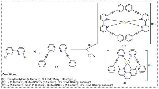 The synthetic protocol of the ligands and complexes are depicted in Scheme 1. The ligand 6,6′-bis(phenylethynyl)-2,2′-bipyridine (L1) was prepared by a Pd(II)/Cu(I)-catalyzed Sonogashira cross-coupling reaction between 6,6′-dibromo 2,2′-bipyridine and phenylacetylene [16]. The chemical structure of the ligand was confirmed using 1H/13C-NMR (Supporting Information). Homo- and heteroerotic Cu(I) complexes were obtained by self-assembly of the 6,6′-bis(phenylethynyl)-2,2′-bipyridine (L1) and 2,9-dimethyl-1,10-phenanthroline (dmph) ligands.
