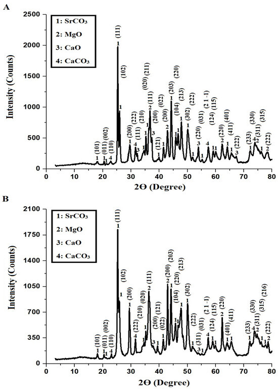Figure 1A,B present the XRD patterns of AE500 and AE700 nanocomposites, respectively, revealing the presence of multiple crystalline phases, including strontium carbonate (SrCO3), magnesium oxide (MgO), calcium oxide (CaO), and calcium carbonate (CaCO3). The diffraction peaks of SrCO3, identified using JCPDS card No. 01-074-1491, correspond to the orthorhombic crystal system, with characteristic 2θ angles at 18.04°, 20.45°, 21.19°, 25.28°, 25.92°, 29.59°, 34.62°, 35.26°, 36.29°, 39.87°, 41.55°, 44.27°, 45.85°, 46.69°, 47.84°, 50.16°, 51.84°, 55.19°, 59.17°, 60.12°, 65.57°, 72.30°, 76.28°, and 77.64°, corresponding to the Miller indices (101), (011), (002), (111), (102), (200), (210), (020), (211), (121), (022), (203), (104), (220), (213), (302), (222), (031), (124), (115), (411), (233), (315), and (216), respectively. The cubic MgO phase, confirmed by JCPDS card No. 01-078-0430, exhibits diffraction peaks at 36.72°, 42.92°, 62.33°, 74.65°, and 78.27°, corresponding to the Miller indices (111), (200), (220), (311), and (222), respectively. The cubic CaO phase, identified using COD card No. 1000044, presents diffraction peaks at 32.32°, 37.36°, 53.94°, 64.11°, and 67.25°, with corresponding Miller indices (111), (200), (220), (311), and (222), respectively. The rhombohedral CaCO3 phase, confirmed by COD card No. 1010928, exhibits diffraction peaks at 22.96°, 31.57°, 57.40°, and 73.98°, corresponding to the Miller indices (110), (222), (2 1 −1), and (330), respectively. The average crystallite size of the AE500 and AE700 samples is 64.53 nm and 75.34 nm, respectively, indicating an increase in crystallite size with higher synthesis temperatures. This increase can be attributed to enhanced atomic mobility and grain growth at elevated temperatures, which facilitate coalescence of smaller crystallites into larger structures, leading to improved crystallinity and reduced lattice strain.
