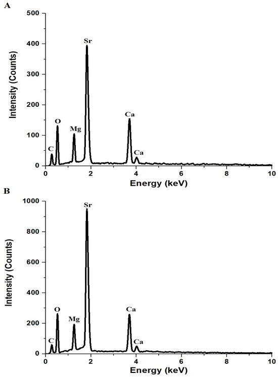 Figure 2A,B presents the EDX spectra of AE500 and AE700 nanocomposites, respectively, confirming the presence of carbon (C), oxygen (O), magnesium (Mg), calcium (Ca), and strontium (Sr) as the primary elemental components. Table 1 provides the atomic percentages of these elements in both samples, revealing variations in elemental composition upon increasing the synthesis temperature. The carbon content in AE500 and AE700 is 19.1% and 16.7%, respectively, which can be attributed to the residual carbonaceous species from the Pechini sol-gel synthesis method that involved tartaric acid and polyethylene glycol 400 as complexing and stabilizing agents. During synthesis, these organic components decompose and volatilize upon heating, with higher temperatures facilitating further carbon removal, explaining the lower carbon content in AE700 compared to AE500. The oxygen content slightly increases from 55.8% in AE500 to 56.8% in AE700, suggesting enhanced oxidation or reduced presence of residual organic species at elevated temperatures. The atomic percentage of magnesium decreases slightly from 5.1% in AE500 to 4.8% in AE700, while calcium exhibits a more pronounced reduction from 8.6% to 7.4%, possibly due to variations in precursor decomposition or phase transformations during heat treatment. In contrast, the strontium content increases from 11.4% to 14.3%, indicating preferential retention or enrichment of Sr-containing phases at higher temperatures. These compositional differences between AE500 and AE700 reflect the thermal decomposition behavior of the precursors and the structural evolution of the nanocomposite, with elevated temperatures promoting crystallite growth, phase stabilization, and a reduction in residual carbonaceous content.