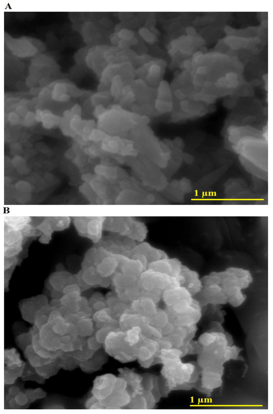 FE-SEM images of (A) AE500 and (B) AE700 nanocomposites.