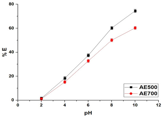 Influence of pH on the removal efficiency (% E) of crystal violet dye using AE500 and AE700 nanocomposites.