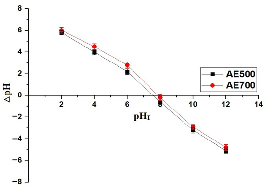 Point of zero charge (pHPZC) determination for the AE500 and AE700 nanocomposites.