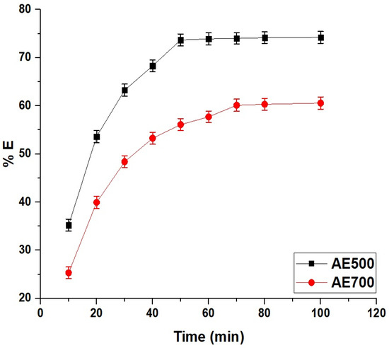 Time-dependent removal efficiency (% E) of crystal violet dye using AE500 and AE700 nanocomposites.