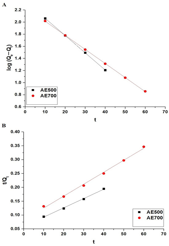 The adsorption kinetics of crystal violet dye onto AE500 and AE700 nanocomposites were analyzed using the pseudo-first-order and pseudo-second-order models, as presented in Figure 9A,B, respectively. The pseudo-first-order model is described by Equation (3) [44].