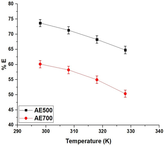 Effect of temperature on the removal efficiency (% E) of crystal violet dye using AE500 and AE700 nanocomposites.