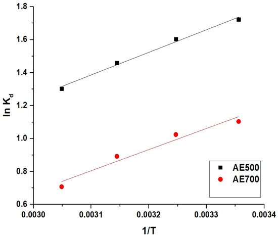 The thermodynamic parameters for the adsorption of crystal violet dye onto AE500 and AE700 nanocomposites were determined using Equations (5)–(7) [45]. The equilibrium distribution coefficient (Kd, L/g) was calculated using Equation (5).