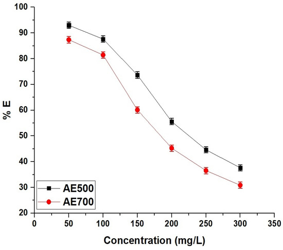 Effect of initial concentration of dye on the removal efficiency (% E) of crystal violet dye using AE500 and AE700 nanocomposites.
