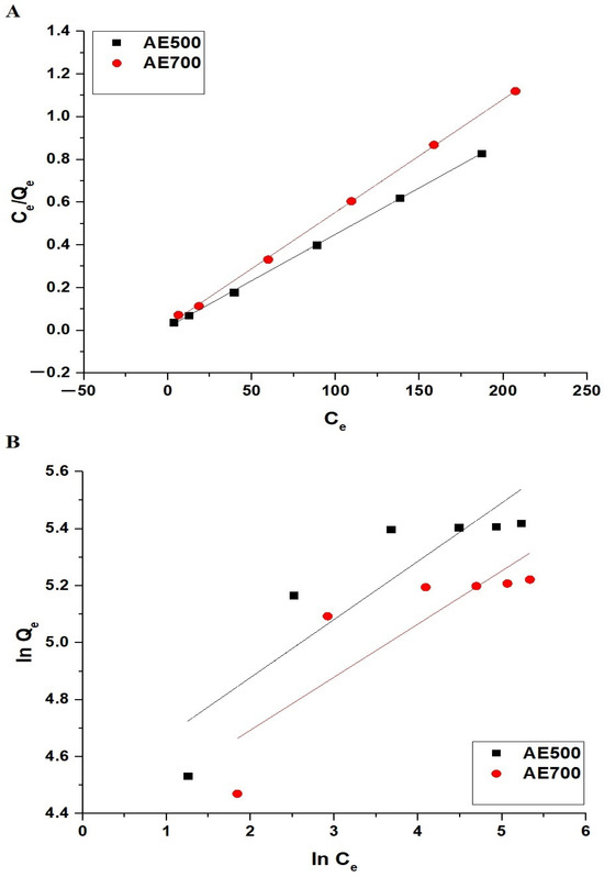 The adsorption behavior of crystal violet dye onto AE500 and AE700 nanocomposites was analyzed using the Langmuir and Freundlich isotherm models, as shown in Figure 13A,B, respectively. The Langmuir isotherm model is expressed by Equation (8) [46].