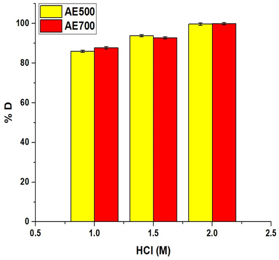 To evaluate the reusability of the synthesized adsorbents, regeneration experiments were carried out by desorbing the crystal violet dye from the dye-loaded AE500 and AE700 nanocomposites. Hydrochloric acid (HCl) was employed as the eluting agent at varying concentrations of 1.0 M, 1.5 M, and 2.0 M. A fixed volume of 50 mL of each HCl solution was used to treat the dye-laden adsorbents under controlled conditions to facilitate the desorption process. The desorption efficiency was assessed by determining the desorption percentage of crystal violet dye (% D), which was calculated using Equation (11).