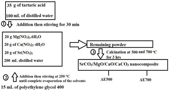 The synthesis of SrCO3/MgO/CaO/CaCO3 nanocomposites was carried out using the Pechini sol-gel method, as illustrated in Figure 16. Initially, 35 g of tartaric acid was dissolved in 100 mL of distilled water under continuous stirring. Separately, 20 g of Mg(NO3)2·6H2O, 20 g of Ca(NO3)2·4H2O, and 20 g of Sr(NO3)2 were dissolved in 200 mL of distilled water. The tartaric acid solution was then gradually added to the nitrate solution with continuous stirring for 30 min. The molar ratio of tartaric acid:Mg(NO3)2·6H2O:Ca(NO3)2·4H2O:Sr(NO3)2 is 15:5:5:6. Subsequently, 15 mL of polyethylene glycol 400 was introduced into the mixture, and the solution was heated at 250 °C until complete evaporation of the solvents (distilled water and polyethylene glycol 400). The resulting precursor powder was subjected to calcination at 500 and 700 °C for 3 h to obtain SrCO3/MgO/CaO/CaCO3 nanocomposites, which were designated as AE500 and AE700, respectively.