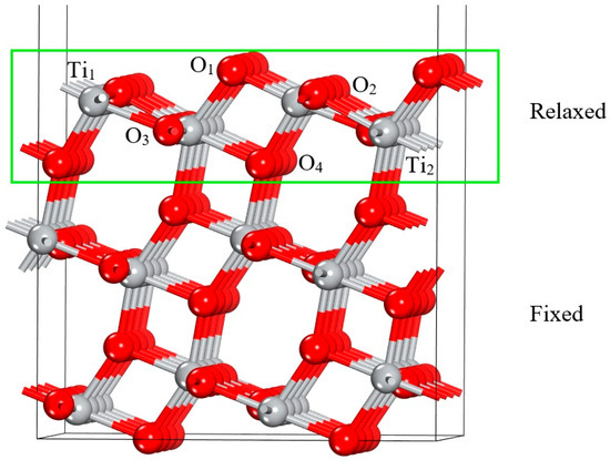 To model the anatase (101) TiO2 surface a slab was constructed using a (3 × 3) 12-atom primitive unit cell, resulting in a periodic slab containing 144 atoms. The slab consists of three trilayers, each containing upper and bottom layers of O atoms bonded with a middle layer of titanium atoms. Prior to adsorption, the uppermost trilayer was fully relaxed while the underlying layers were constrained to their bulk positions, as illustrated in Figure 1. The top trilayer was relaxed to capture adsorption-induced effects, while the bottom two trilayers were fixed to bulk positions, consistent with studies showing minimal subsurface relaxation influence [6,30]. Our calculated structural parameters demonstrate excellent agreement with both the experimental surface X-ray diffraction (SXRD) measurements and DFT values reported by Treacy et al. [31]. Specifically, our computed lattice parameters (a = 10.26 Å, b = 3.71 Å) closely match the SXRD measurements (a = 10.23 Å, b = 3.79 Å). The atomic displacements within the first trilayer, as illustrated in Figure 1 and quantified in Table 1, show strong concordance with the SXRD experimental data. The only notable exception is the O2 atom, which exhibits a somewhat larger displacement in our calculations; however, this finding aligns with the DFT results obtained by Treacy et al. This structural consistency validates the robustness of our computational framework for modeling the anatase TiO2 (101) surface.
