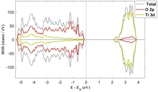 The computed total density of states (DOS) of the pristine surface is presented in Figure 2. It can observe hybridization between O 2p and 3d states in the valence band (VB) with major contributions of O 2p states. In the case of the conduction band (CB), it is primarily constituted of Ti 3d states, with a small contribution from O 2p states. This composition is consistent with previous works [32,33].
