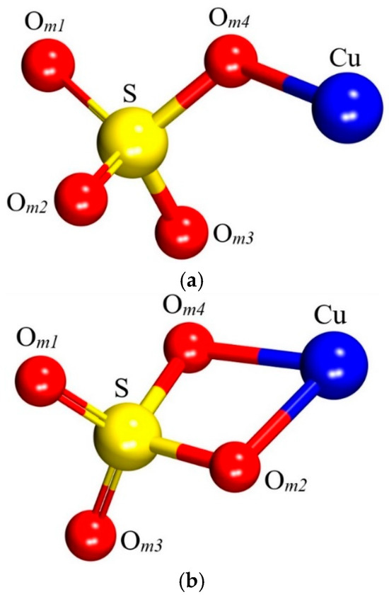 The anhydrous form of CuSO4 was selected to model the molecule, as it simplifies the adsorption study by avoiding the complexity introduced by hydration water molecules. This approach allows for a more direct evaluation of the interaction between CuSO4 and the TiO2 (101) surface, minimizing computational cost and focusing on the fundamental adsorption mechanisms, with its initial geometry based on the experimental crystallographic data reported by Wildner and Giester [34]. The free molecule was constructed by positioning it at the center of a 15 × 15 × 15 Å3 cubic supercell and subjecting it to full atomic relaxation. The optimized molecular structure is presented in Figure 3 and Table 2.