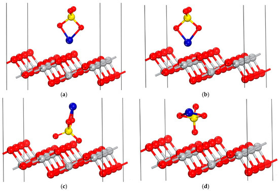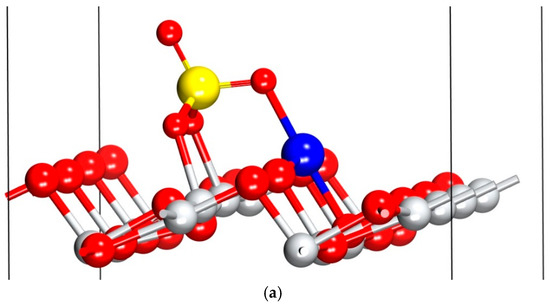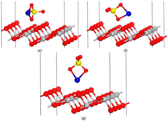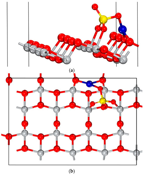 To the best of our knowledge, no studies based on density functional theory (DFT) have specifically focused on the surface adsorption of this molecule on TiO2. Previous research has addressed other related aspects and has experimentally demonstrated that modifying TiO2 with CuSO4 (copper sulfate) significantly alters its electronic and catalytic properties [27]. In particular, CuSO4 has been used as a dopant in TiO2 with the aim of enhancing its photocatalytic activity under visible light irradiation, especially for the degradation of organic pollutants in water [28]. This line of research emerges from the need to develop more efficient, accessible, and environmentally sustainable catalysts and photocatalysts, both for the reduction of NOx compounds in industrial emissions and for water pollutant treatment [29].
