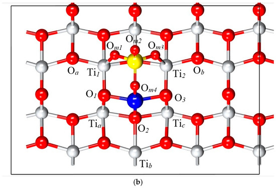 Figure 6 illustrates the resulting structure of the adsorption process, highlighting the formation of bonds between the molecule and the surface, which indicates a chemisorption mechanism. Notably, the molecule binds to the surface through its oxygen and copper atoms. This interaction significantly alters the geometry of both the molecule and the uppermost surface layers, inducing atomic displacements in these regions. To quantify these changes, the interatomic distances and angles of the atoms labeled in Figure 6b were measured and are presented in Table 4. The newly formed bonds are between Om1 and Om3 of the molecule with Ti1 and Ti2 on the surface, while the Cu atom interacts with surface oxygen atoms O1, O2, and O3. As a result of this process, the surface atoms tend to displace toward the molecule, predominantly in the upwards direction. Ti1 and Ti2 move about 0.13 Å, while O1 and O3 show a minor displacement of 0.03 Å. O2, located in a deeper layer, experiences a more significant displacement of 0.21 Å.