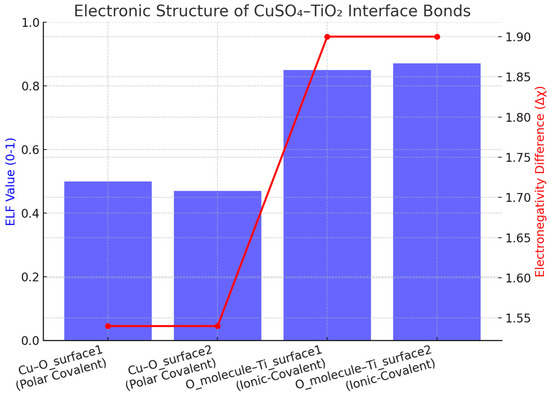 The bar chart represents the ELF values for different bonding interactions at the CuSO4–TiO2 interface. The blue bars indicate ELF values, where Cu–O bonds exhibit moderate electron localization (polar covalent nature), while O–Ti bonds display higher ELF values, supporting an ionic–covalent character. The red line represents the trend of ELF variations across different bonding types.