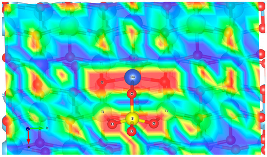 ELF map across the CuSO4–TiO2 interface. Red and yellow regions indicate high ELF values (≥0.78), confirming strong covalent bonding, as seen in the S–O interactions (ELF~0.78–0.80). Green regions around the Cu–O bonds suggest moderate electron localization (ELF~0.47–0.50), characteristic of polar covalent interactions. The blue regions surrounding the O–Ti bonds indicate a mixed ionic–covalent interaction.