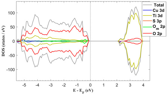 The computed DOS of the system with the adsorbed molecule is presented in Figure 9. Analysis of these data reveals a band gap width of 2.19 eV, which is narrower than the 2.27 eV observed for the pristine surface. Regarding the band’s composition, it can be noticed that the VB exhibits some minor presence of O 2p and Cu 3d states from the molecule. Sulfur states are also present at deep energy levels within the VB, but their intensity is very small and thus not distinguishable in the graph.