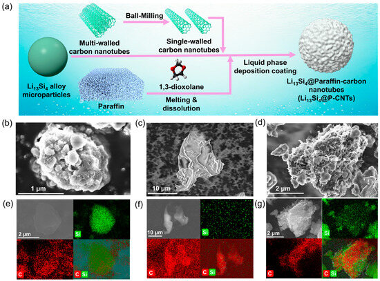 (a) Schematic illustration for the synthesis of the Li13Si4@P-CNTs pre-lithiation additives. (b–d) SEM images of (b) pristine Li13Si4, (c) paraffin and (d) Li13Si4@P-CNTs. (e–g) SEM and EDS elemental mappings of (e) pristine Li13Si4, (f) paraffin and (g) Li13Si4@P-CNTs.