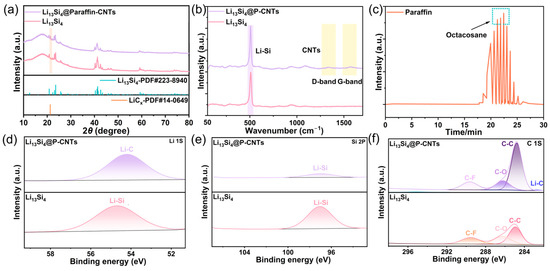 (a) XRD and (b) Raman spectrum of pristine Li13Si4 and Li13Si4@P–CNTs. (c) Py–GCMS of paraffin. (d–f) XPS spectrum of (d) Li 1s, (e) Si 2p and (f) C 1s of pristine Li13Si4 and Li13Si4@P-CNTs.