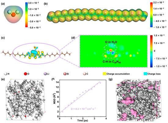 To further understand the hydrophobicity and environmental stability exhibited by the Li13Si4@P-CNTs after paraffin coating, density functional theory (DFT) and molecular dynamics simulations were performed and analyzed (paraffin was replaced by its main component, Octacosane, C28H58). As shown in the electrostatic potential mapping image of the water molecule (Figure 4a and Figure S6a), the local electrostatic potential of H2O varies from −0.479 eV to 0.240 eV. The H atoms and O atoms separately exhibit strong positive potential and negative potential, indicating that the H2O molecule exhibits strong polarity. However, the low difference in surface electrostatic potential (−0.084 eV~0.042 eV) and weak polarity can be observed in paraffin (C28H58) in Figure 4b and Figure S6b. Furthermore, a charge density difference was measured to qualitatively analyze the charge density distribution at the hetero-interface of H2O-C28H58. Figure 4c illustrates the charge depletion in cyan and charge accumulation in yellow. Meanwhile, the charge density distribution (Figure 4c,d) further illustrates that the hetero-interface zones exhibit a small concentration of both positive and negative charge densities. The positive charges exhibit a low tendency to accumulate on H atoms of C28H58 and the negative ones are slightly probable to gather on the O atom of H2O. This illustrates that paraffin coating exhibits weak dipole–dipole interaction with negatively charged O atoms of H2O (van der Waals force). Therefore, the paraffin-dominant hydrophobic coating membrane of Li13Si4@P-CNTs improves their environmental stability in humid air.