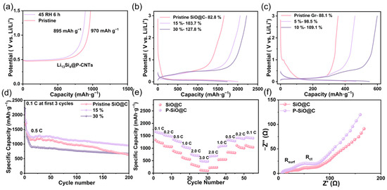 (a) The initial pre-lithiation capacity of Li13Si4@P-CNTs electrodes before and after exposure in 45% RH humid air for 6 h. (b,c) The initial charge/discharge profiles of (b) SiO@C and (c) Gr electrodes with various amounts of Li13Si4@P-CNTs. (d) Comparison of the reversible capacities for SiO@C electrodes with various amounts of Li13Si4@P-CNTs. (e) Rate performance and (f) electrochemical impedance spectroscopy (EIS) of P-SiO@C and SiO@C electrodes after 200 cycles.