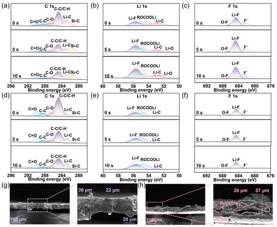 The SEI formation evolution and volume expansion of pre-lithiated anodes after cycling are systematically investigated in this section. To further analyze the chemical components of the anode surface before and after pre-lithiation of SiO@C at different thicknesses, the electrode surface is deeply etched at 5-second intervals with etching times of 0, 5 and 10 s. As shown in the XPS C 1s spectrum of SiO@C/P-SiO@C anodes (Figure 6a,d), the peaks with binding energies of 281.5 eV, 283.2 eV, 284.8 eV, 286.5 eV, 289 eV and 290 eV correspond to characteristic peaks associated with bonds of Si-C, Li-C, C-C/C-H, C-O, C-C and C=O. As shown in Figure 6b,e, the deconvolution of XPS Li 1s peaks can be divided into Li-O (51.5 eV), Li-C (52.8 eV), ROCOOLi (55 eV) and LiF (55.7 eV) [48,49,50,51]. The intense peaks near 682.5 eV, 684.7 eV and 687 eV originate from F−, LiF and LiPOFz, respectively [52,53]. These results indicate that surface components of SiO@C and P-SiO@C are composed of LixC, SiC, free fluoride ion, organic lithium salts (ROCOOLi) and inorganic lithium salts (LiF, Li2O and LiPOFz).