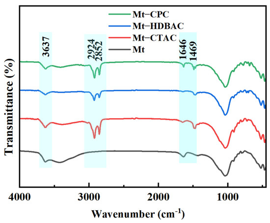 The purpose of IR spectral analysis is to determine whether CTAC, HDBAC, and CPC are physically adsorbed on the surface of Mnt [20]. The FTIR spectra of the modified Mnt and surfactant are shown in Figure 1. In the Mnt samples without QAS treatment, the hydroxyl stretching vibration for crystallized water in Mnt appeared at 3637 cm−1, while the bending vibrations of hydroxyl, Al-Al-OH, and Al-Mg-OH of crystallized water appeared at 1646 cm−1 [21]. There was no vibration peak at 2924–2852 cm−1 and 1469 cm−1, and after QASs treatment, the absorption peaks of the alkyl, benzyl, and pyridine organic groups appeared in Mnt-CTAC, Mnt-HDBAC, and Mnt-CPC samples, respectively, indicating that the hydrophobic surfactants were adsorbed onto the surface of Mnt. The modified Mnt did not give rise to IR peaks other than those belonging to Mnt and the corresponding surfactants, confirming that the interaction between the alkyl, benzyl, and pyridine groups of the hydrophilic ends of CTAC, HDBAC, CPC, and Mnt is physical adsorption.