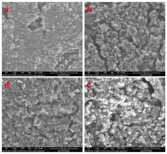 Figure 2 shows the ESEM images of Mnt before and after CTAC, HDBAC, and CPC modification in the semi-dry state. The morphology of the semi-dry state helps determine the hydrophobic floc effect of Mnt [22], which can be used to qualitatively estimate the dispersion state of Mnt in an aqueous solution after the adsorption of QASs. From the suspension state to the semi-dry state, the Mnt particles shown in Figure 2a undergo dry shrinkage and bond together, and no large flocs appear. Therefore, it can be inferred that Mnt was dispersed in the aqueous solution, and no flocs were generated. Figure 2b–d show that from the suspension state to the semi-dry state, the modified Mnt is composed of large, loosely arranged particles with a rough surface, which do not bond together. It is thus inferred that the modified Mnt forms flocs in aqueous solution. Therefore, the addition of QASs made the Mnt hydrophobic and formed hydrophobic flocs in water.