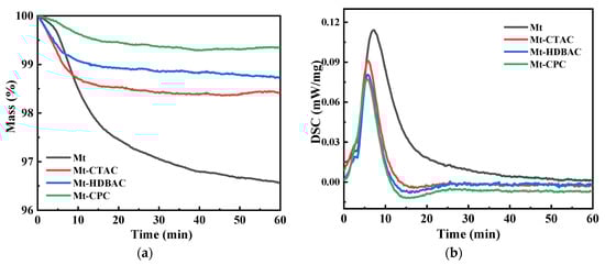Furthermore, TG-DSC tests were conducted on the montmorillonite samples before and after hydrophobic modification to investigate the desorption behavior of surface-adsorbed water during drying, as well as to evaluate the hydrophobic effect on the Mnt surface. Figure 2 shows the TG-DSC results of Mnt in the semi-dry to dry state before and after the hydrophobic modification. Table 1 shows the changes in mass and heat values before and after Mnt modification. Figure 3a shows the TG curve of Mnt after weight loss when the temperature was maintained at 60 °C for 1 h. As shown in Figure 3a and Table 1, the surface water content of the hydrophobically modified Mnt was less than that of the unmodified sample. These findings highlight the presence of a strong dipole–dipole interaction between the hydrophilic moieties of the QASs and the surface of Mnt. This modification makes the surface of the aluminosilicate layer more hydrophobic and reduces the water content of the Mnt [23]. The hydrophobic effect of QASs decreases in the following order: CPC > HDBAC > CTAC, suggesting that