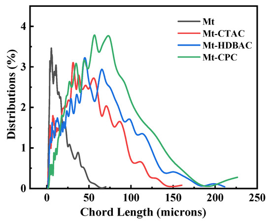 -Mnt interaction.To further compare the hydrophobic floc effect, the hydrophobic floc size of Mnt was investigated using FBRM. Figure 4 shows the particle size distribution of the Mnt samples at a surfactant concentration of 0.045 mol/L. The results show that the particle size of the unmodified Mnt is mostly in the range of 0–20 μm, while that of the modified Mnt hydrophobic floc was significantly increased, mostly in the range of 50–100 μm. After the adsorption of surfactants, a hydrophobic attraction is established between the Mnt interfaces [24], which overcomes hydration and electrostatic repulsion and leads to the formation of hydrophobic flocs [25]. The energy of the flocs increased along with the particle size and binding energy [22].