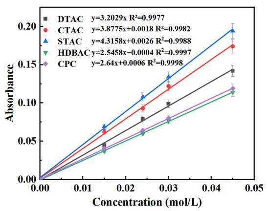 Figure 6 shows the standard operating curves of DTAC, CTAC, STAC, HDBAC, and CPC obtained in the experiment. DTAC and STAC were added to analyze the interactions between the hydrophobic end of the QASs and Mnt. It can be seen from Figure 6 that the absorbance value has good linearity with respect to the mass concentration curves of the QASs, indicating that it is feasible to measure the mass concentration of QASs by using the different absorbances of the association formed by the reaction of BTB with QASs at 576 nm.