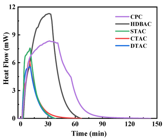 To confirm the law of dipole interaction, the VDW interaction energies between Mnt and the three reagents in aqueous solution were measured using microcalorimetry. As shown in Figure 8, the adsorption heats of different QASs (DTAC, CTAC, STAC, HDBAC, and CPC) interacting with Mnt at the same molarity were compared. Under identical concentration conditions, the absolute values of adsorption heat followed the order STAC > CTAC > DTAC. This trend indicates that increasing the alkyl chain length enhances the likelihood of contact between reagent molecules and Mnt particles in aqueous solution, thereby strengthening the interaction and resulting in greater heat release. Corresponding data are summarized in Table 3.